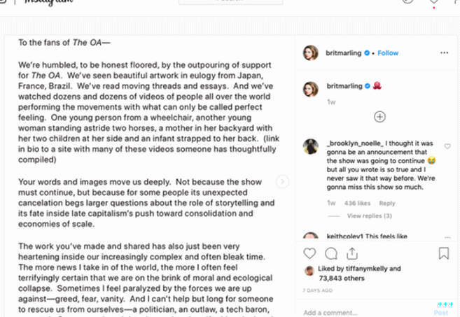 Током викенда, Марлинг је објавила дуго писмо њеним фановима показати на Инстаграму. У њој је приметила да је ОА „неочекивано отказивање поставља већа питања о улози приповиједања и њену судбину унутар касног капитализма гурање ка консолидацији и економија обима. “Не спомиње Нетфлик, али то се подразумева. Док је затварала ноту, прогласила је да је прича емисије не дуже пише сама или Батманглиј; то се узимало преко навијача. “Стојиш на уличним угловима сунце у знак протеста. Упознајете нове људе у чудним удубљењима на мрежи и дељење прича о губитку и обнови које никад нисте Мислила сам да ћеш то рећи било коме “, написала је.” Учиш кореографију и кретање на начин који се нисте усудили прећи пре … Све од тога нешто вреди. ”