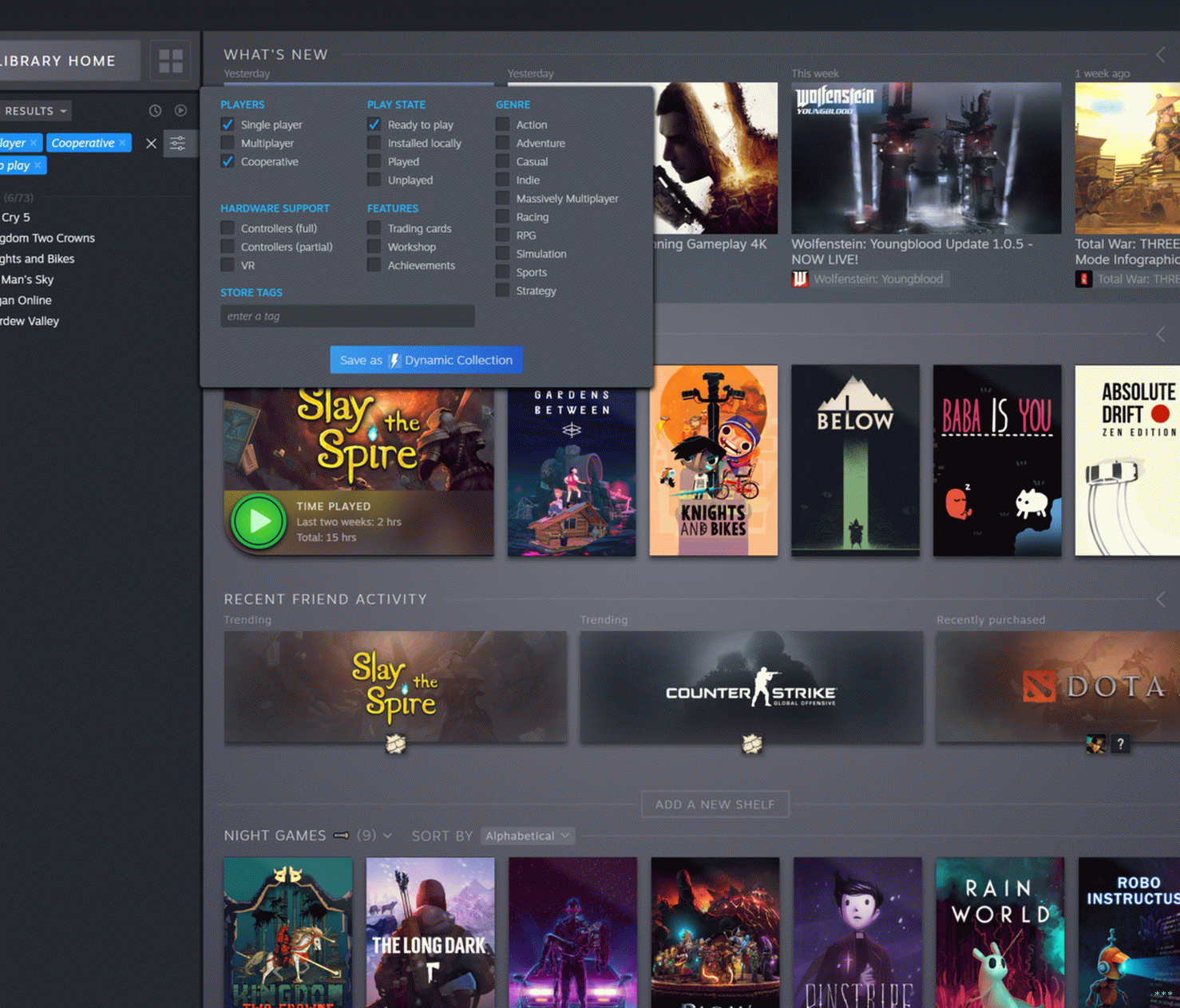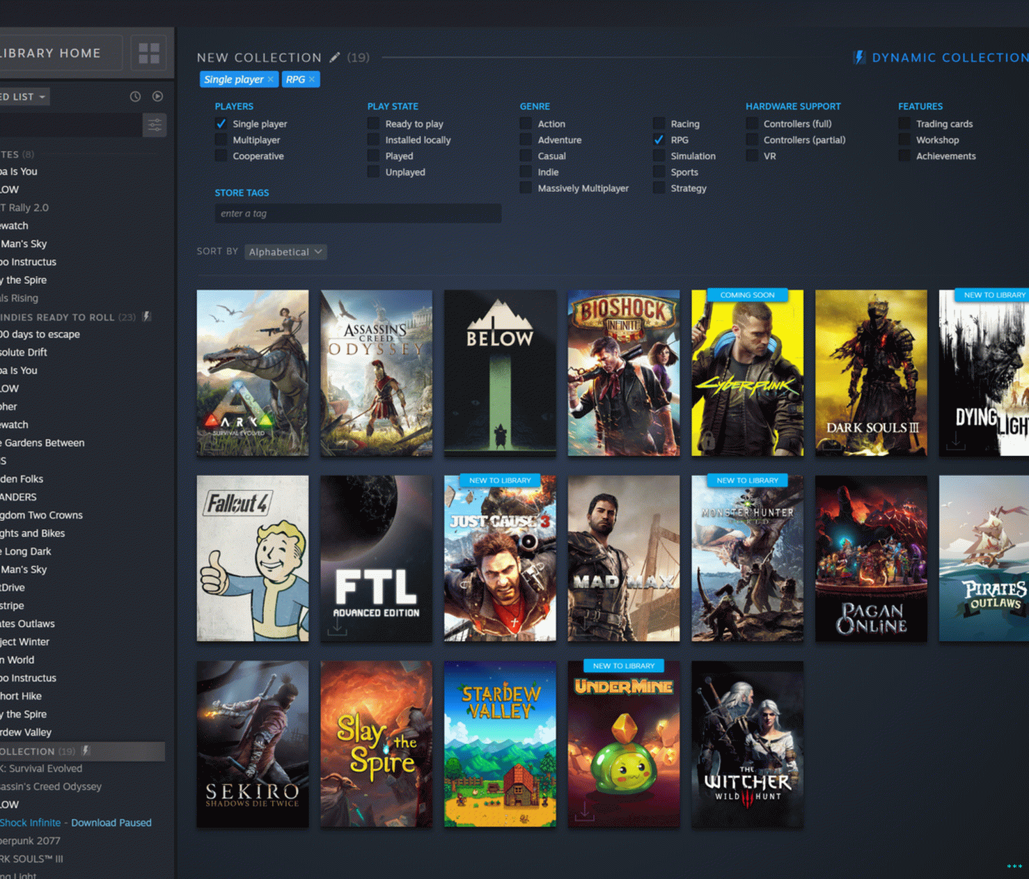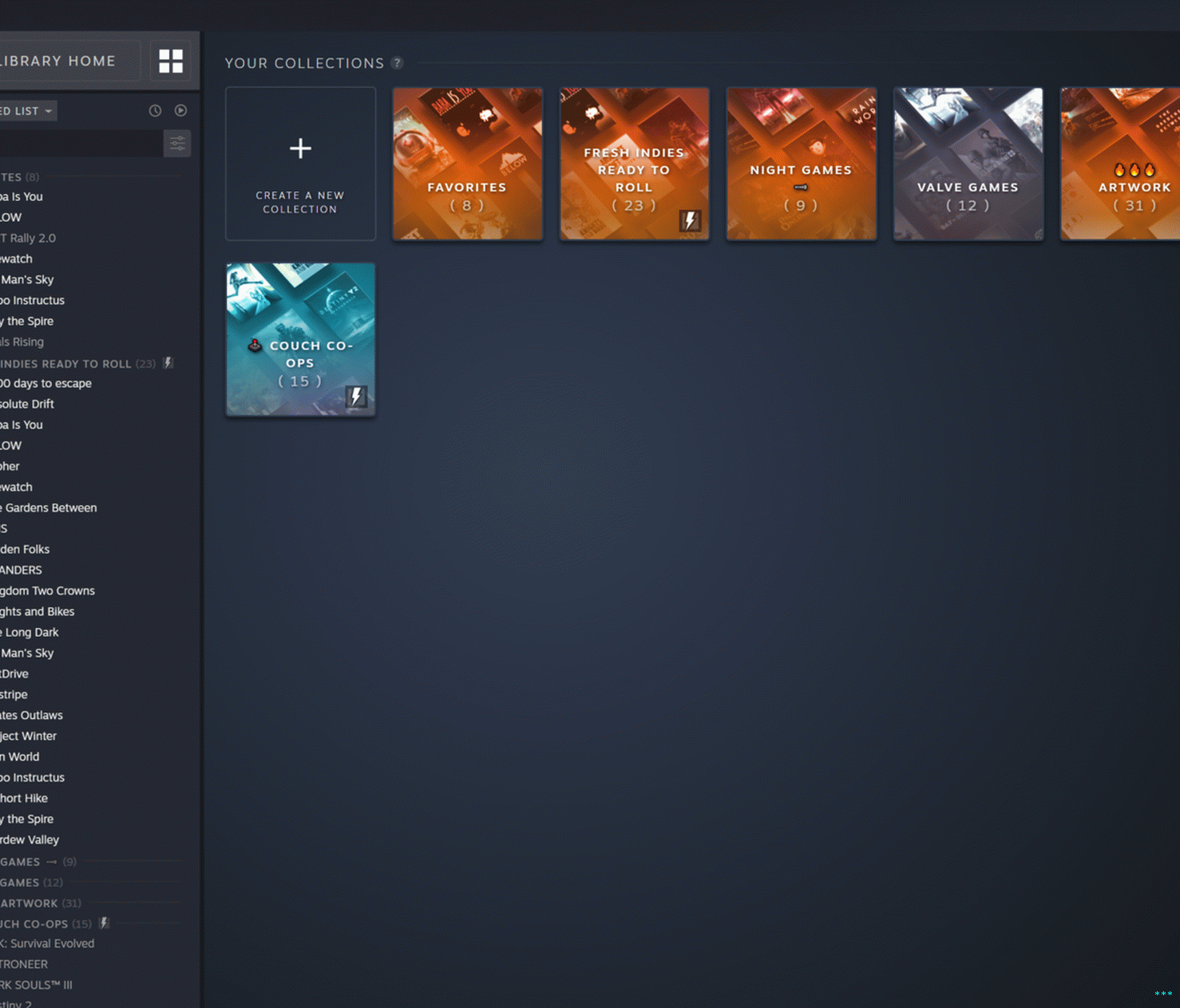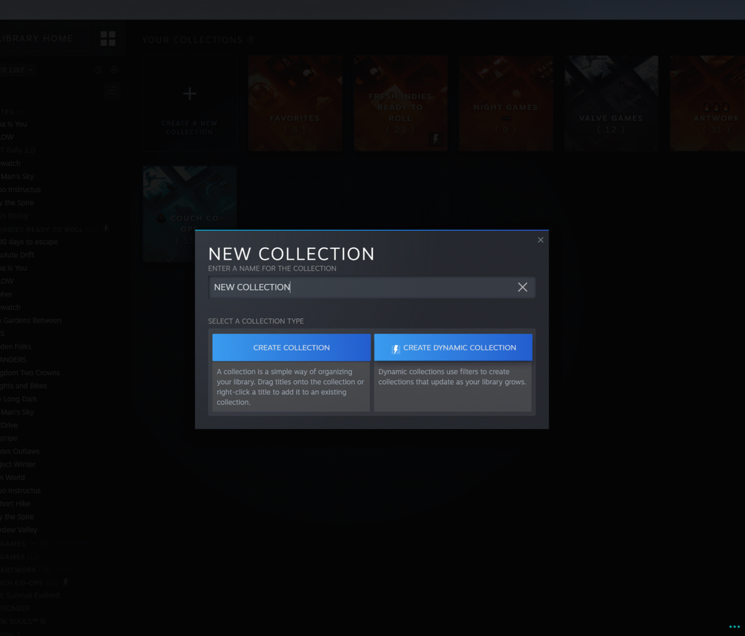 Испод њих се подразумевано налазе ваше “колекције” по мери игре. Статичка колекција може се изградити повлачењем и испуштањем имена игара у одговарајућу збирку. Ово опонаша постојећа, закопана опција за креирање „категорија“ на вашој листи игара. Интересантнија је опција динамичне колекције која омогућава корисницима откуцајте и одаберите описну ознаку коју желите (“сингле-плаиер”, “РПГ”, “турн-басед”, “сплит-сцреен мултиплаиер”, итд.) да би Стеам одабрао све одговарајуће игре у вашој библиотеци. Динамичне колекције ће аутоматски додати све нове куповине које одговарају критеријумима који сте поставили.