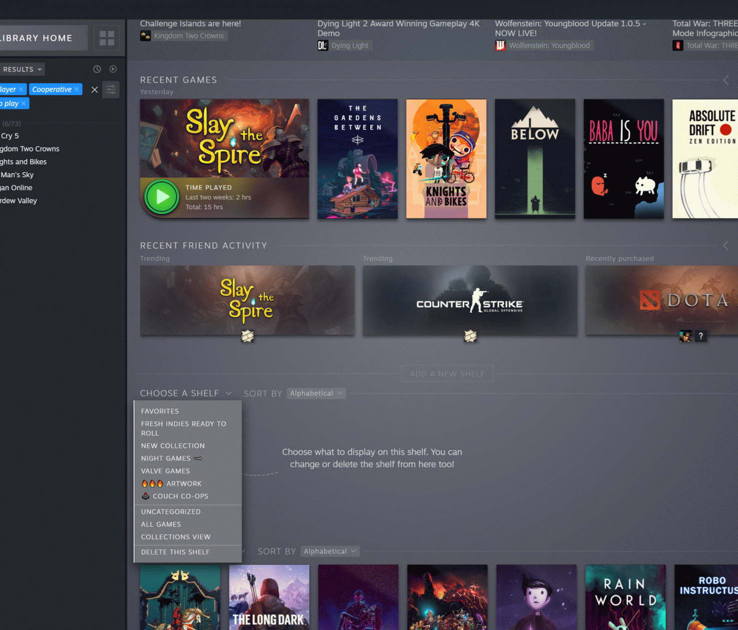 Али оригинални интерфејс увек је посвећивао десни део у једну колону о једној игри. „Пријатељи који су власници ове игре“ била је горња ставка, затим достигнућа, а затим обична депонија текста вести. Ако не одаберете одређену игру, овај простор сада постаје дом за “полице” или редовно ажуриране провале у вестима и активност око игара које већ поседујете. Можете их избрисати ако желите желите, али подразумевани интерфејс укључује неколико корисних сортирања механизми: игре са последњим ажурирањима вести, игре које сте недавно игране и игре које су ваши пријатељи недавно играли.