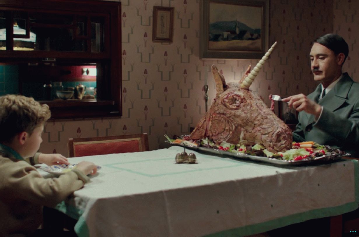 Први званични теасер је пао у јулу, отварајући се са неким добар старомодни шамар у овом Хитлеровом омладинском кампу да нам да укус укупног тона филма. Јојо је мучи остала деца у кампу због тога што су мало преварили – отуда и његов надимак, “Зец.” Његов замишљени БФФ, Адолф, уверава га да су људи говорили гадне ствари о њему такође, такође стално: „Ох, он је лудак. погледај тог психоа, он ће нас све набавити убијен! “(Ваитити је рекао да је Адолф у основи а замена за дечака који је одсутан отац.)